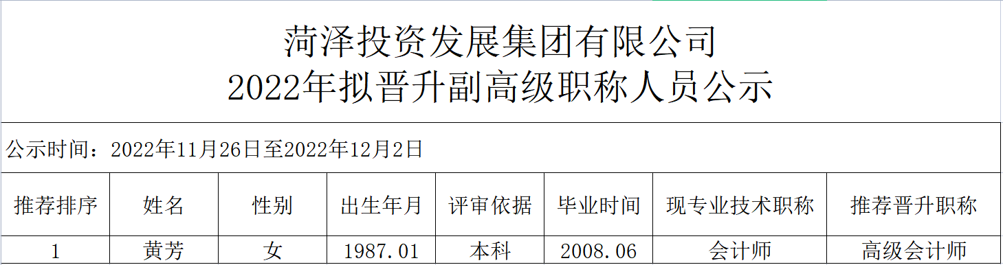 菏澤投資發(fā)展集團有限公司2022年擬晉升副高級職稱人員公示