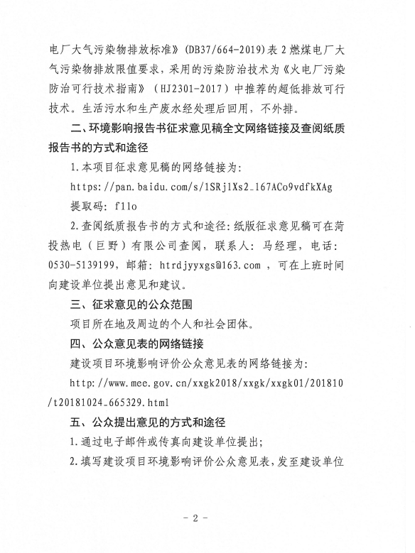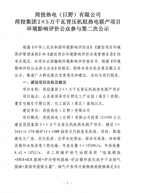菏投集團2×5萬千瓦背壓機組熱電聯(lián)產(chǎn)項目環(huán)境影響評價公眾參與第二次公示